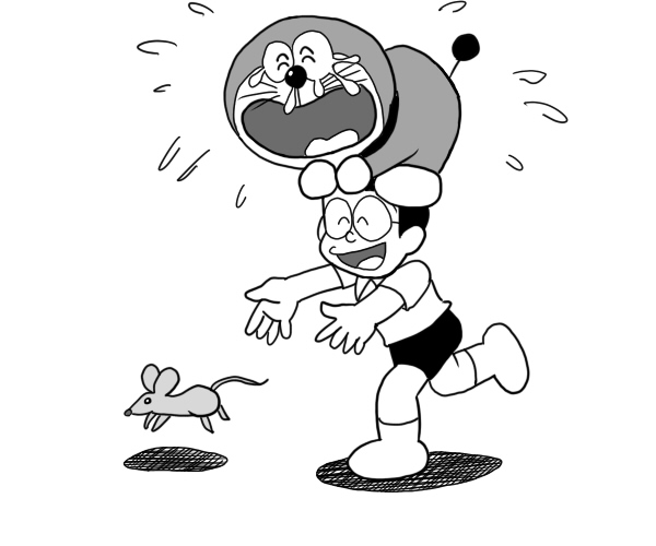 Doraemon and Nobita.He hates mice despite being a cat-type robot because he was nibbled out his ears by it before. This picture is what I reproduced from the original comic book.