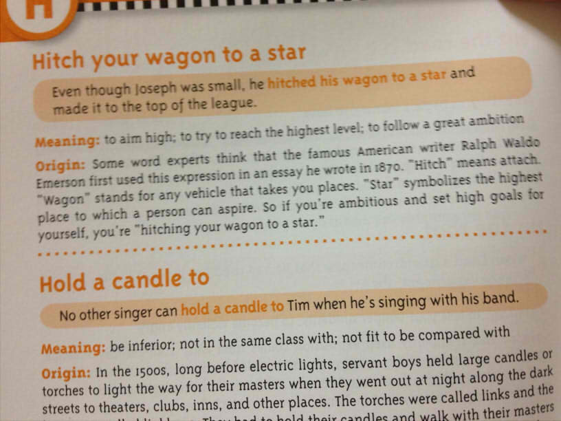 アルファベット順に、700もの英語の慣用表現が収録されています。例文とその意味、そしてその慣用句の語源についての解説もあり、単純に読み物としても楽しめます。(てっとり早く慣用表現だけ覚えたい人は、語源の説明は飛ばすのも良いでしょう)