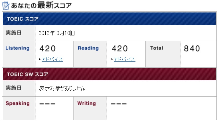結果は、リスニング415、リーディング465の計880。またしても900点超えは逃してしまいました・・・でも、受験2回目なんだからこれぐらいでも良しとすべきなんでしょう。一応、今回はノンネイティブとしては十分な実力とされるAクラス(860以上)には入ることができました。履歴書に書くには、ほぼ申し分ないスコアだと思われます。(ただし、通訳やハイレベルな英語講師の職を希望するなら900点以上欲しいところです。)